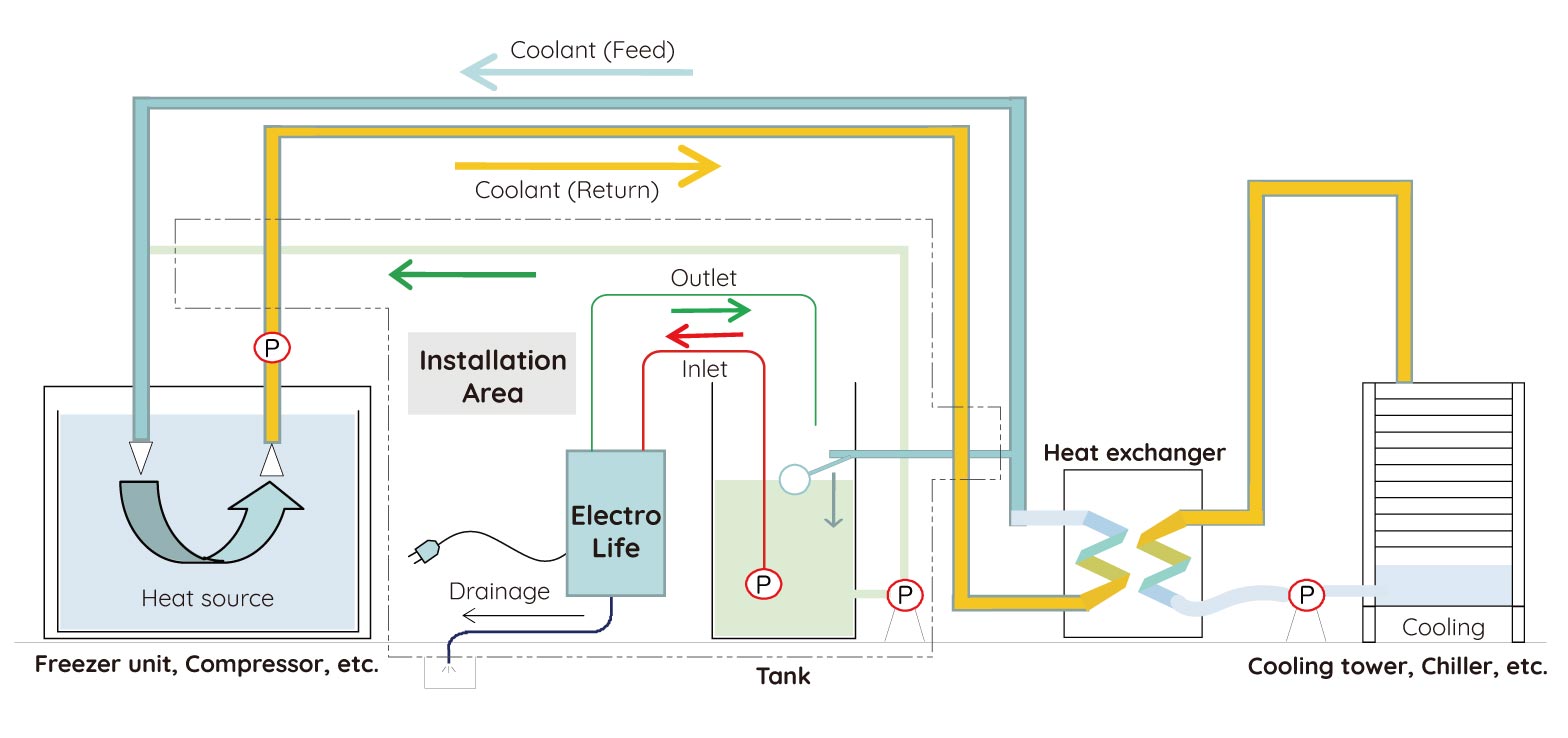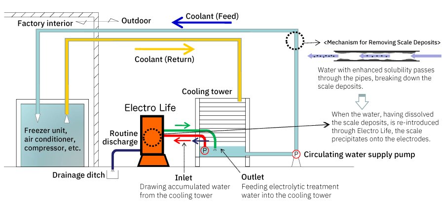 Electro Life is an innovation that utilizes unique electrolysis technology to powerfully eliminate scales attached to the recirculating cooling water system such as cooling towers and chillers. It is also capable of preventing scales from building up again.